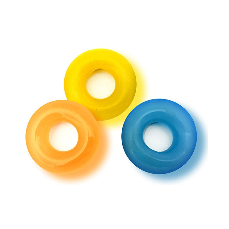 Voilà 3 cockrings colorés qui brillent dans le noir. Ils sont conçus avec une forme de Mini Donutfaciles à placer sur le sexe ou au dessus des testicules.