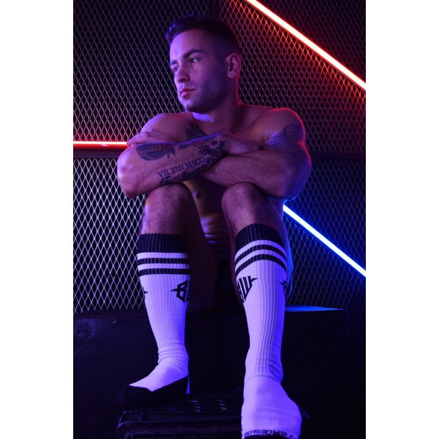Chaussettes hautes blanches avec le logo de la marque et des bandes noires.