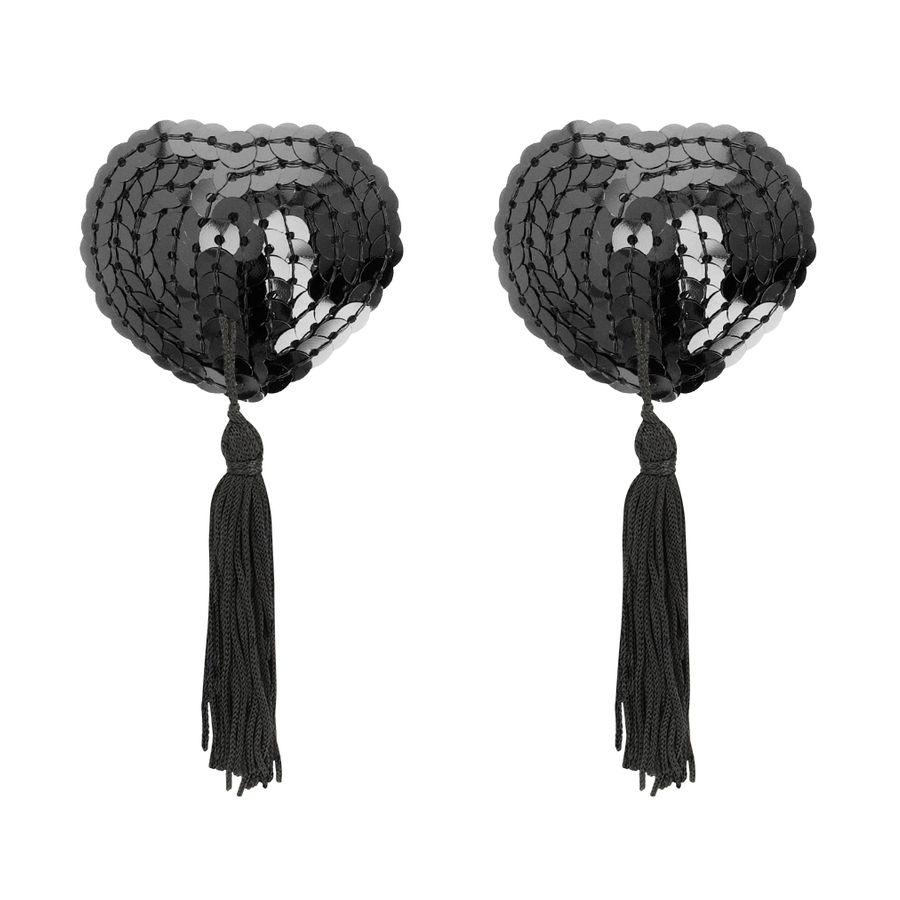 Ces cache-tétons adhésifs de la gamme GLITT sont ici dans leur version noire. Ils sont conçus avec une forme de coeur pailletté et des franges en dessous.