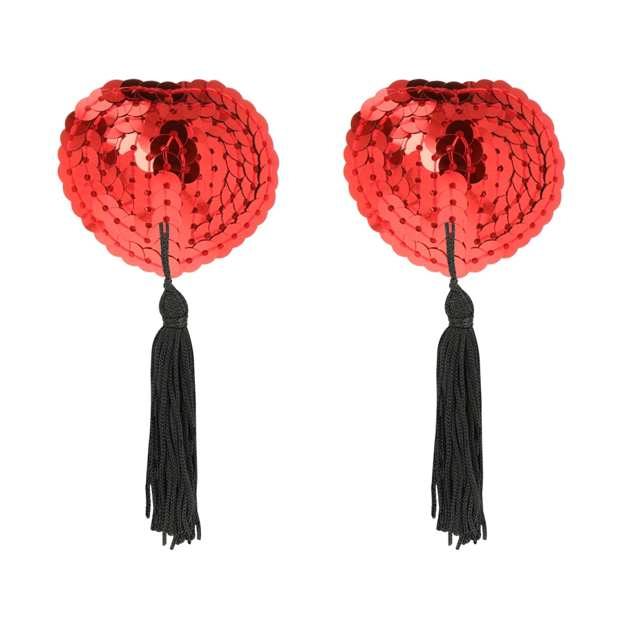 Ces cache-tétons adhésifs GLITT sont rouges avec une forme de coeur et des franges noires en dessous. Les paillettes rouges sont brillantes et apportent un style plus sexy.