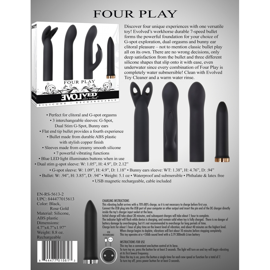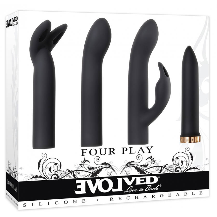 Ce stimulateur de clitoris FOUR PLAY est composé de 3 embouts en silicone avec des formes différentes.