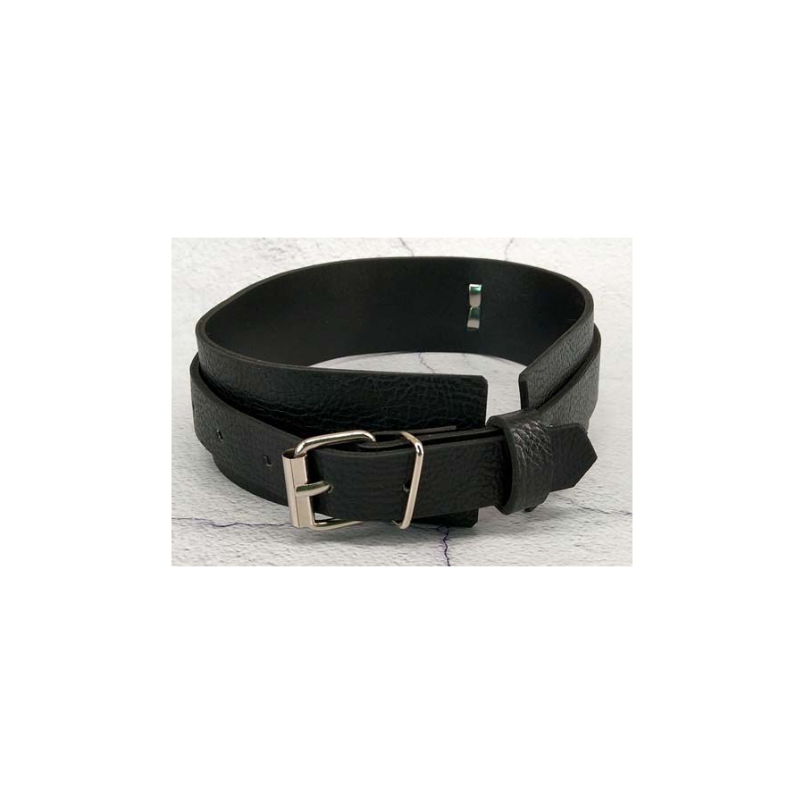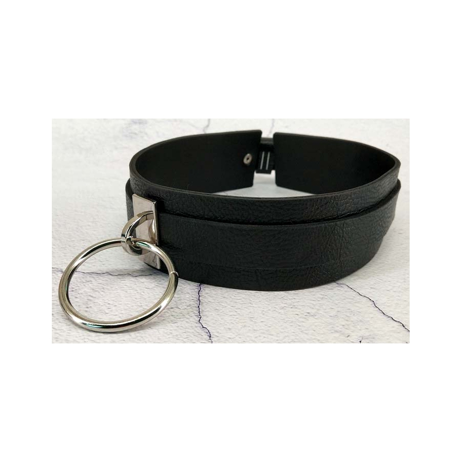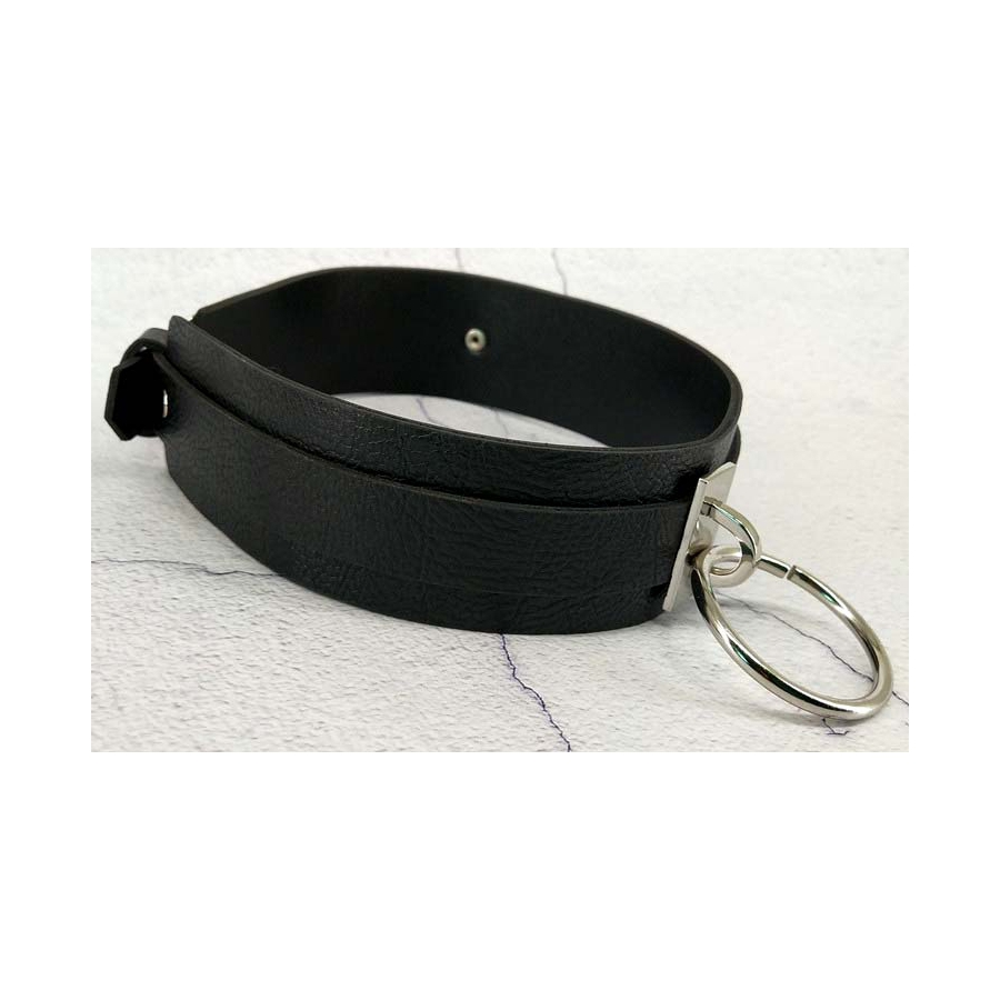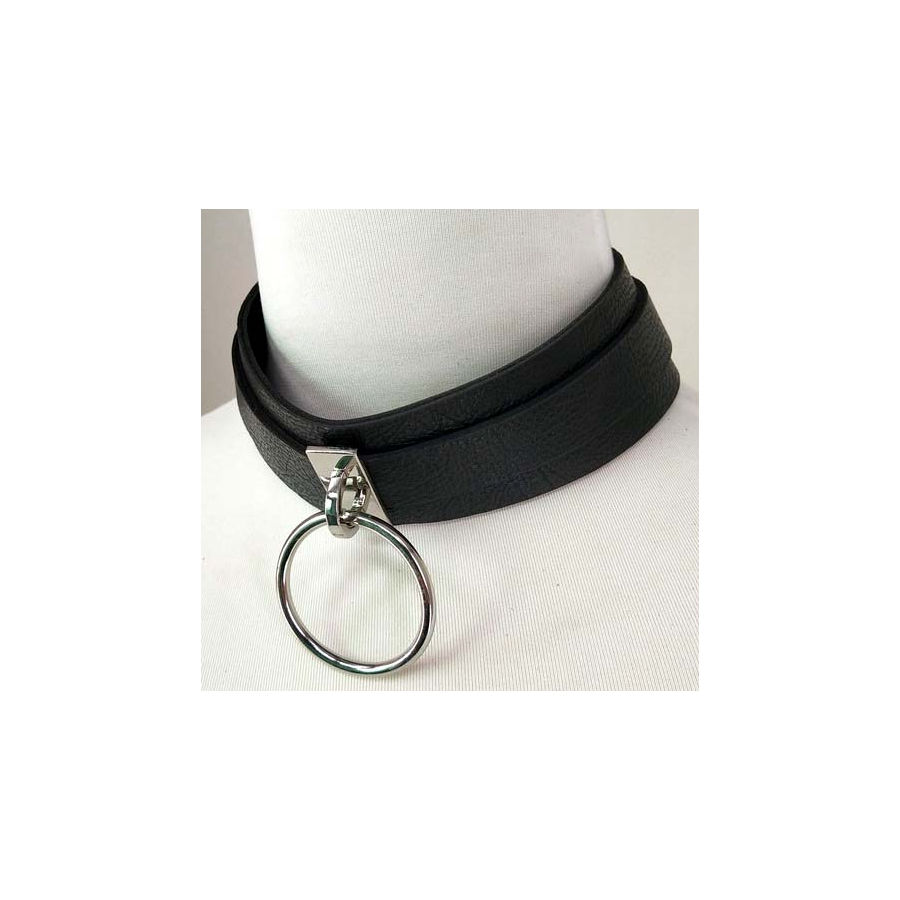 Il se compose de deux lanières sobres superposées et d’un anneau de 5cm de diamètre. Le tour de cou est ajustable par une boucle et mesure de 34 à 42cm.