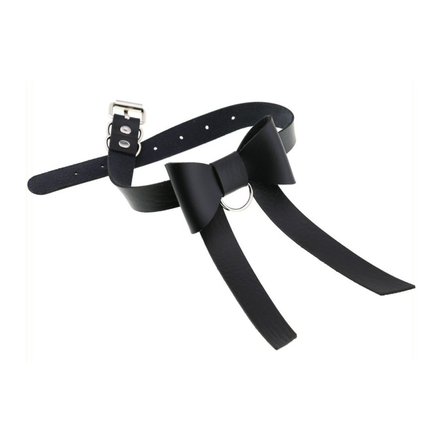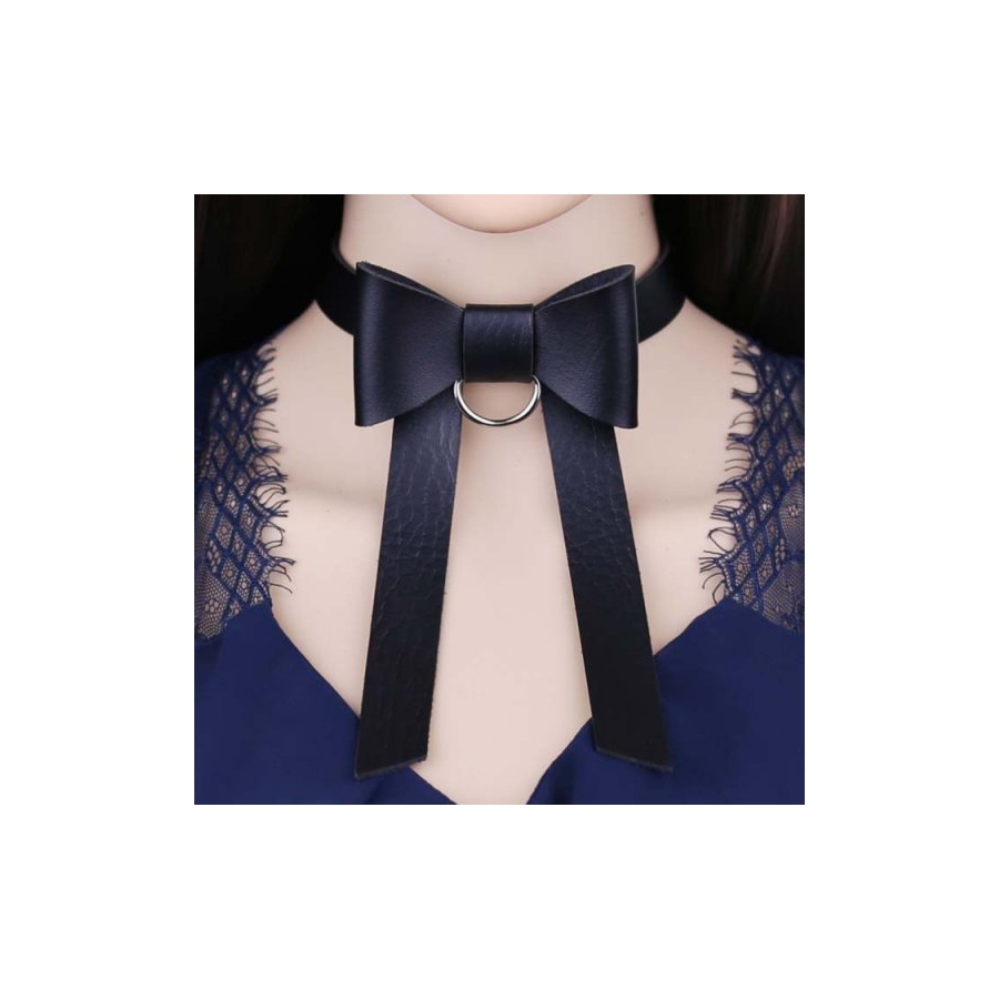 Ras de cou en simili avec un noeud papillon et des attaches métalliques.