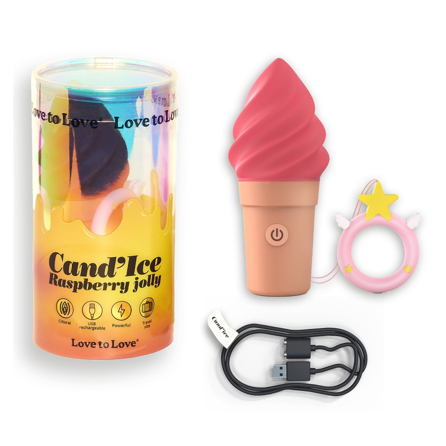 Le stimulateur de clitoris CAND’ICE est ici dans sa version Raspberry Jolly. Il s’agit d’un sextoy original conçu avec une forme de cône glacé.