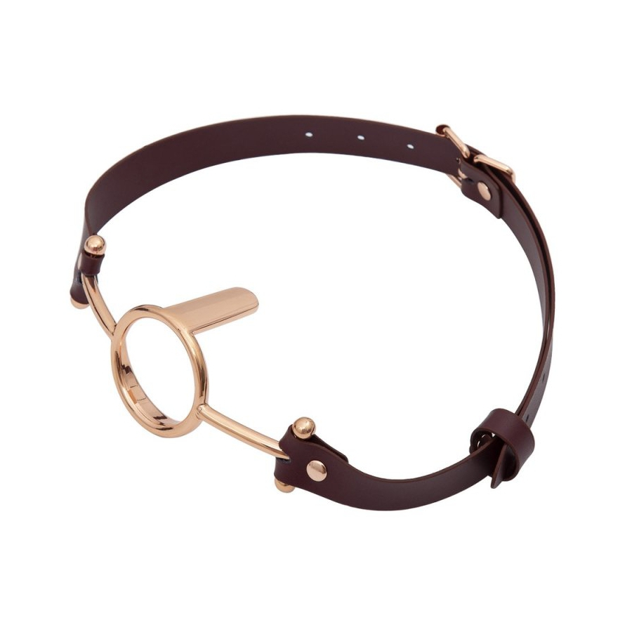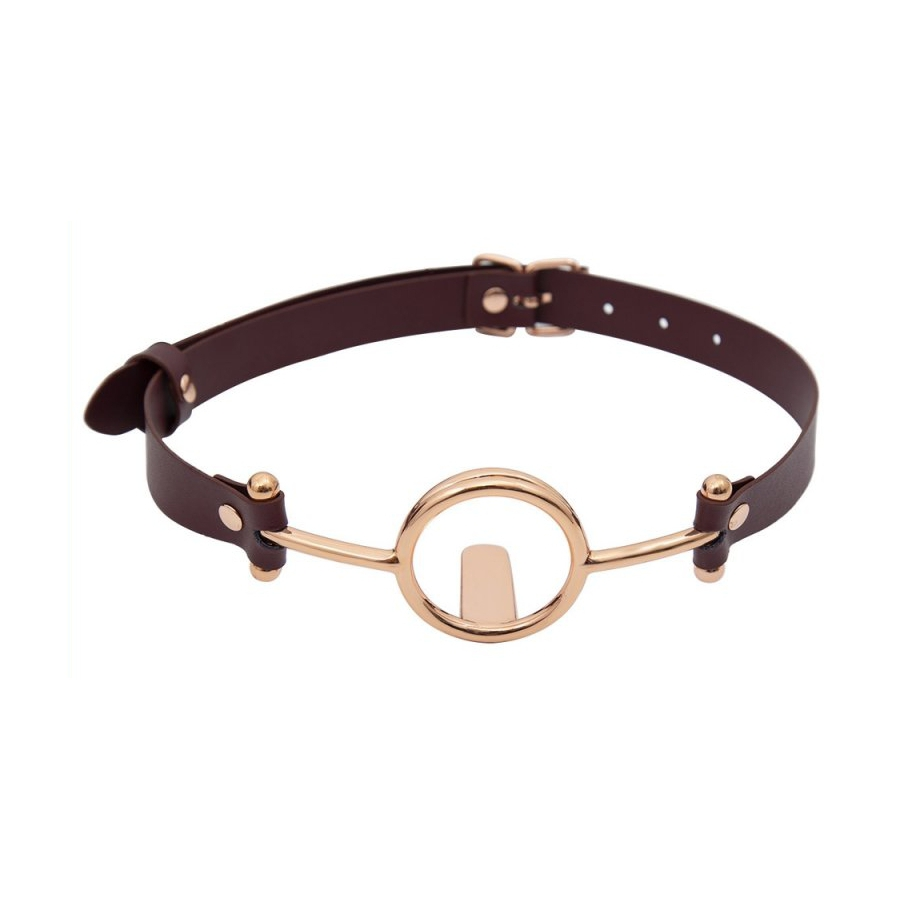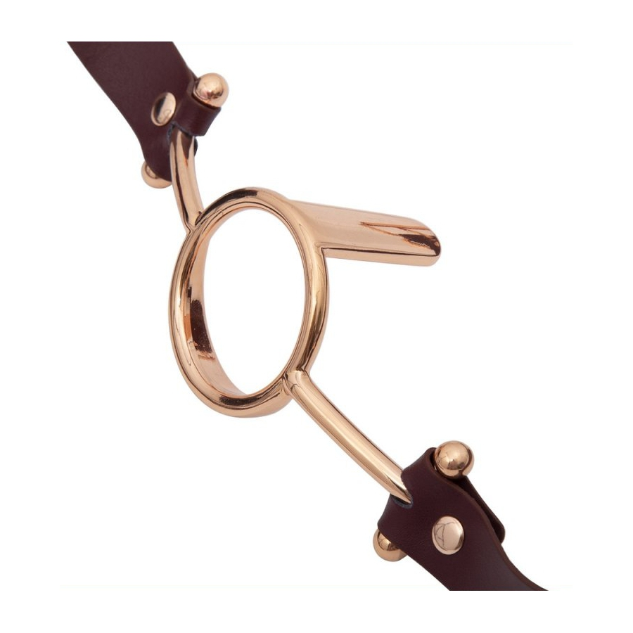 Ce bâillon O TONGUE est un accessoire Sm conçu avec des sangles bordeaux et des éléments en métal couleur Bronze-rosé.
