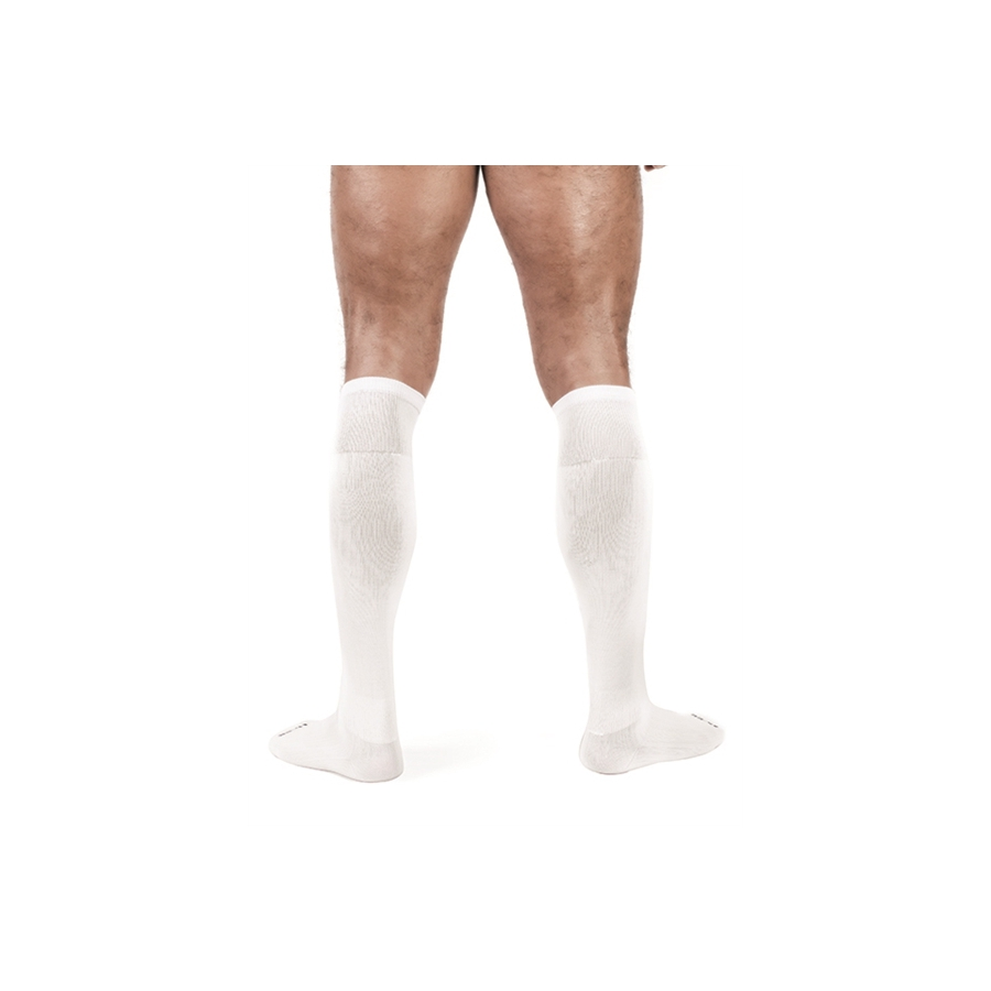 Cette paire de chaussettes blanches est conçue avec une taille haute sur les jambes, enveloppant les mollets. Elles sont idéales pour créer un style sportif.