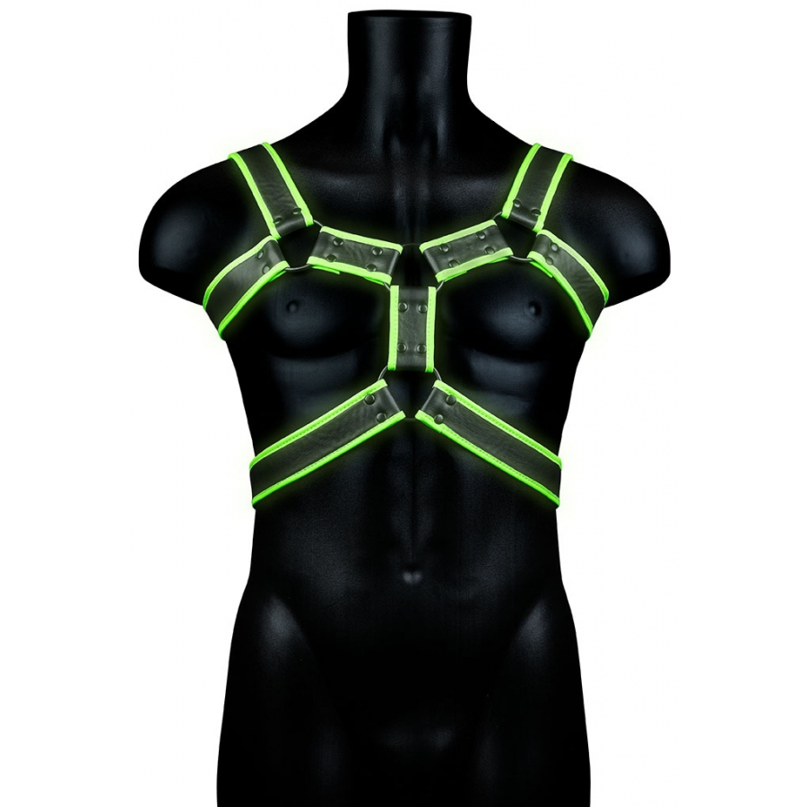 Le harnais phosphorescent GLOW BODY est un accessoire homme composé de bandes ajustables de 4cm de largeur passant autour du buste.