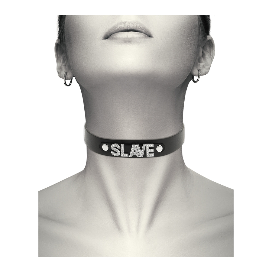 Ce ras de cou de la marque Coquette est un accessoire sexy conçu avec le mot Slave inscrit en lettres brillantes.