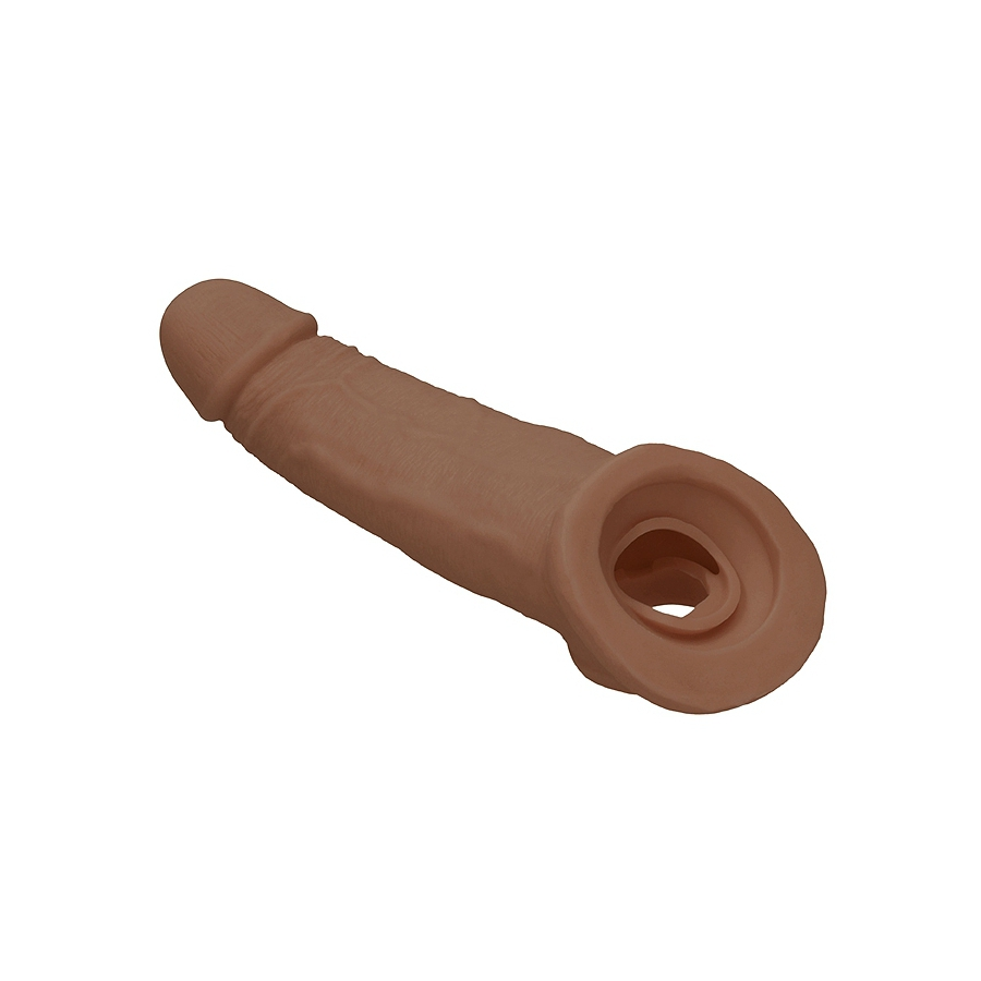 Cette gaine de pénis REALROCK est un accessoire conçu pour donner des formes plus avantageuses au sexe. Elle mesure 17cm de longueur et 4.5cm de largeur. Avec une surface veinée et un gland décalotté.
