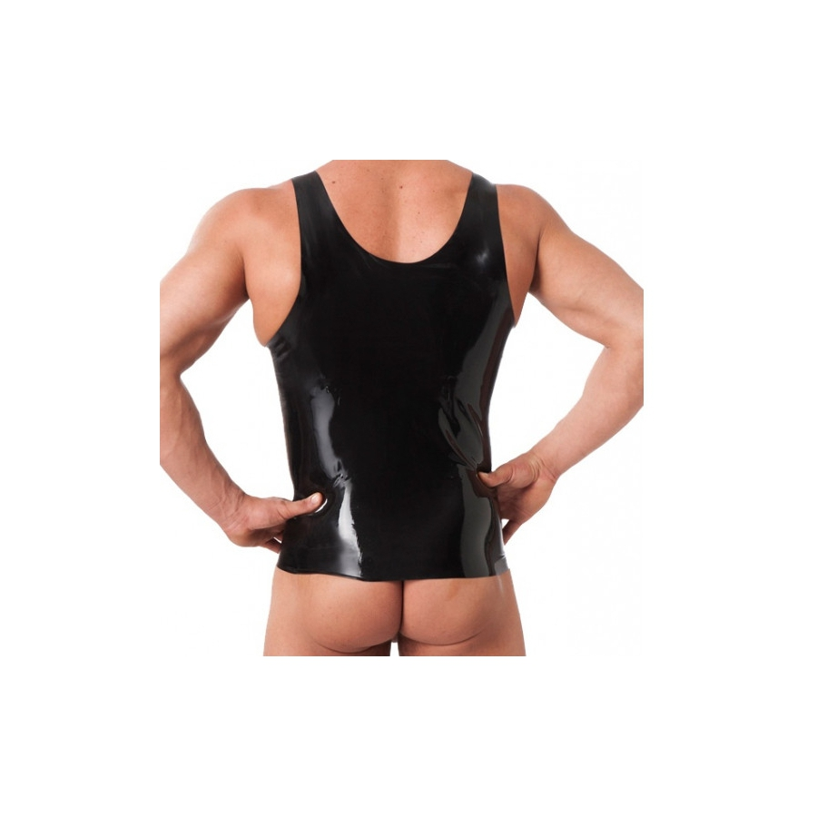 Ce débardeur en latex est proposé sur le sex shop gay par la marque Rimba. Il est réalisé avec des bretelles fines sur les épaules et une coupe ajustée.