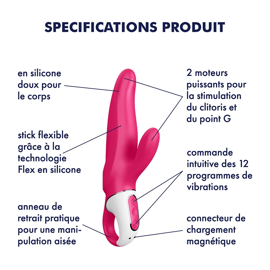 Spécialement conçu pour le plaisir, le vibro prénommé Mr Rabbit est un sextoy rabbit fabriqué dans un silicone doux et flexible.