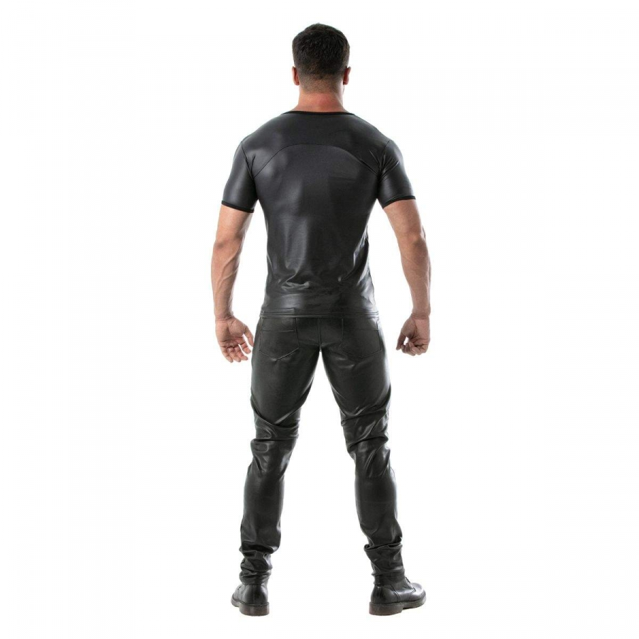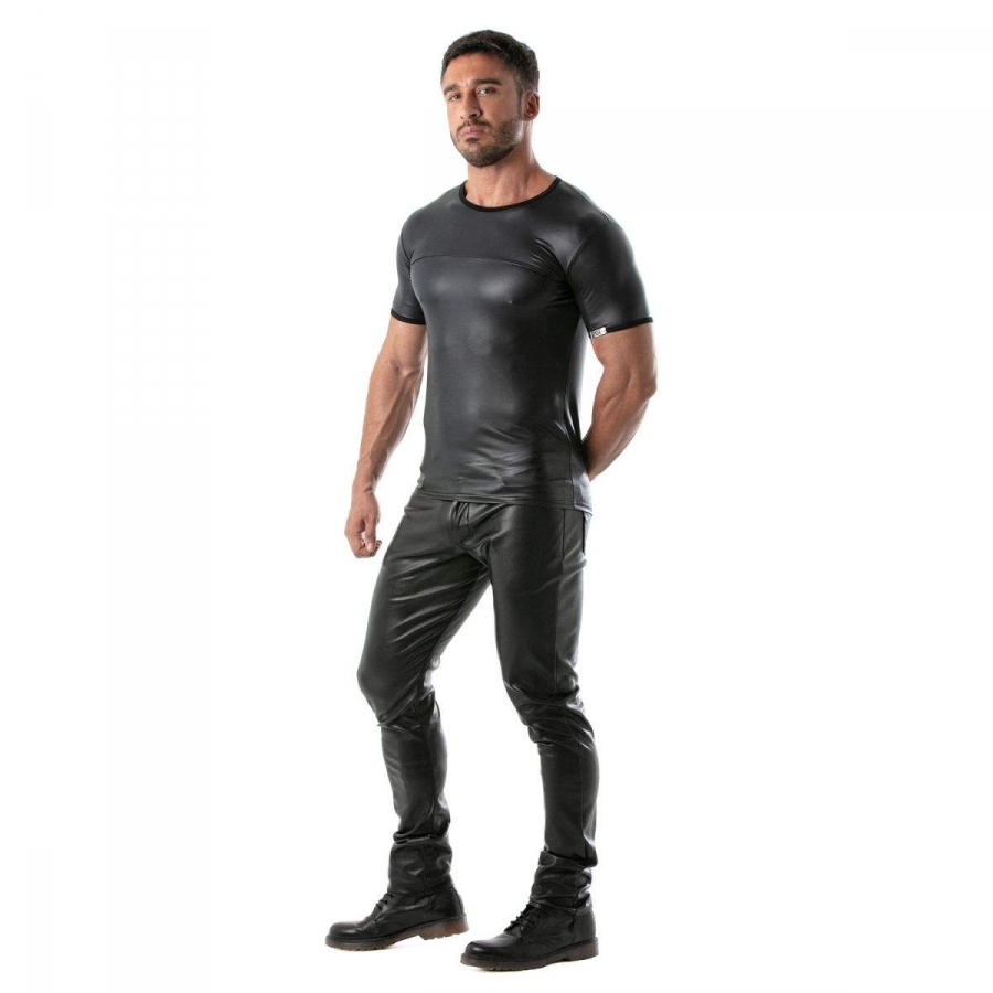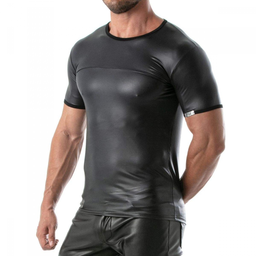 Le T-shirt FETISH noir est un haut masculin de la marque française TOF Paris. Il est composé de manches courtes, d’un col rond et d’un tissu en imitation Vinyle.