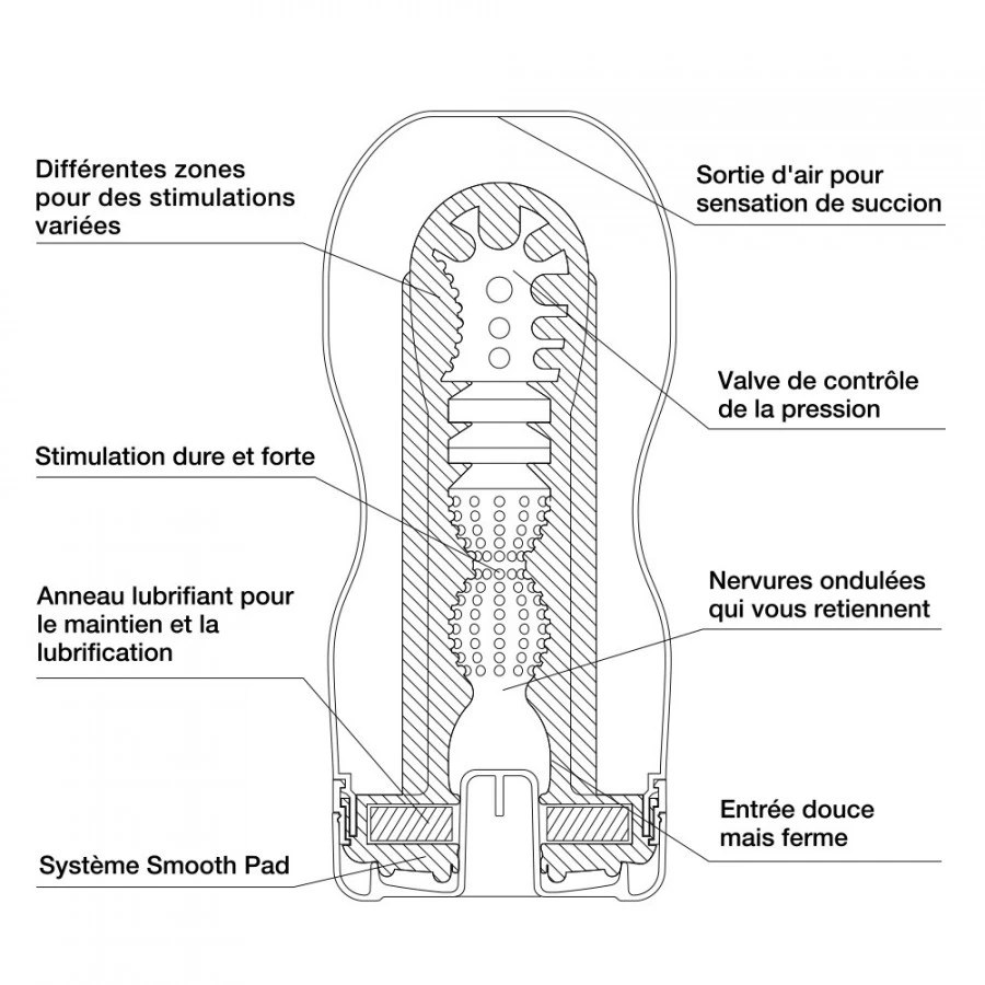 Sa forme de sablier procure un serrage fantastique. et les valves spéciales créent un vide virtuel à l’intérieur du tube et procurent une sensation de succion bluffante.