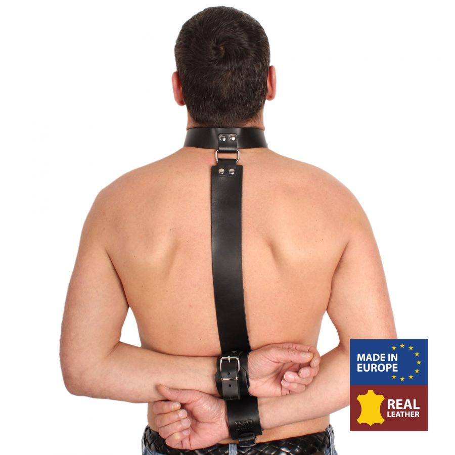 Cet accessoire SM est proposé sur le sex shop gay par la marque The Red. Il est idéal pour attacher les mains et les lier au cou du partenaire.