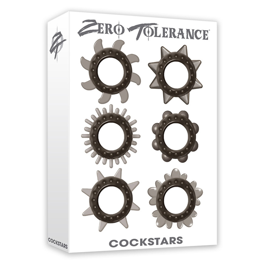 Ce kit COCKSTARS est proposé sur le sexshop gay par la gamme Zero Tolerance. Il est composé de 6 cockrings souples aux formes originales.